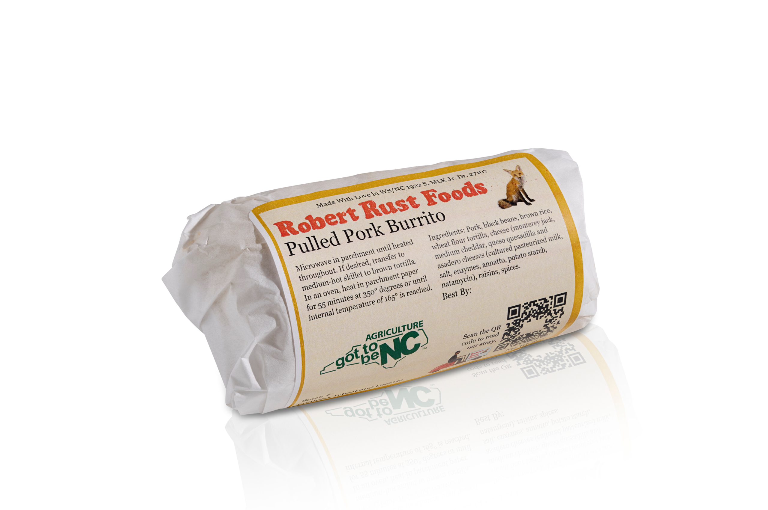 Case of 12 burritos. Hatch red chile marinated pulled pork with, black beans, brown rice, raisins, and cheese in a handmade flour tortilla.