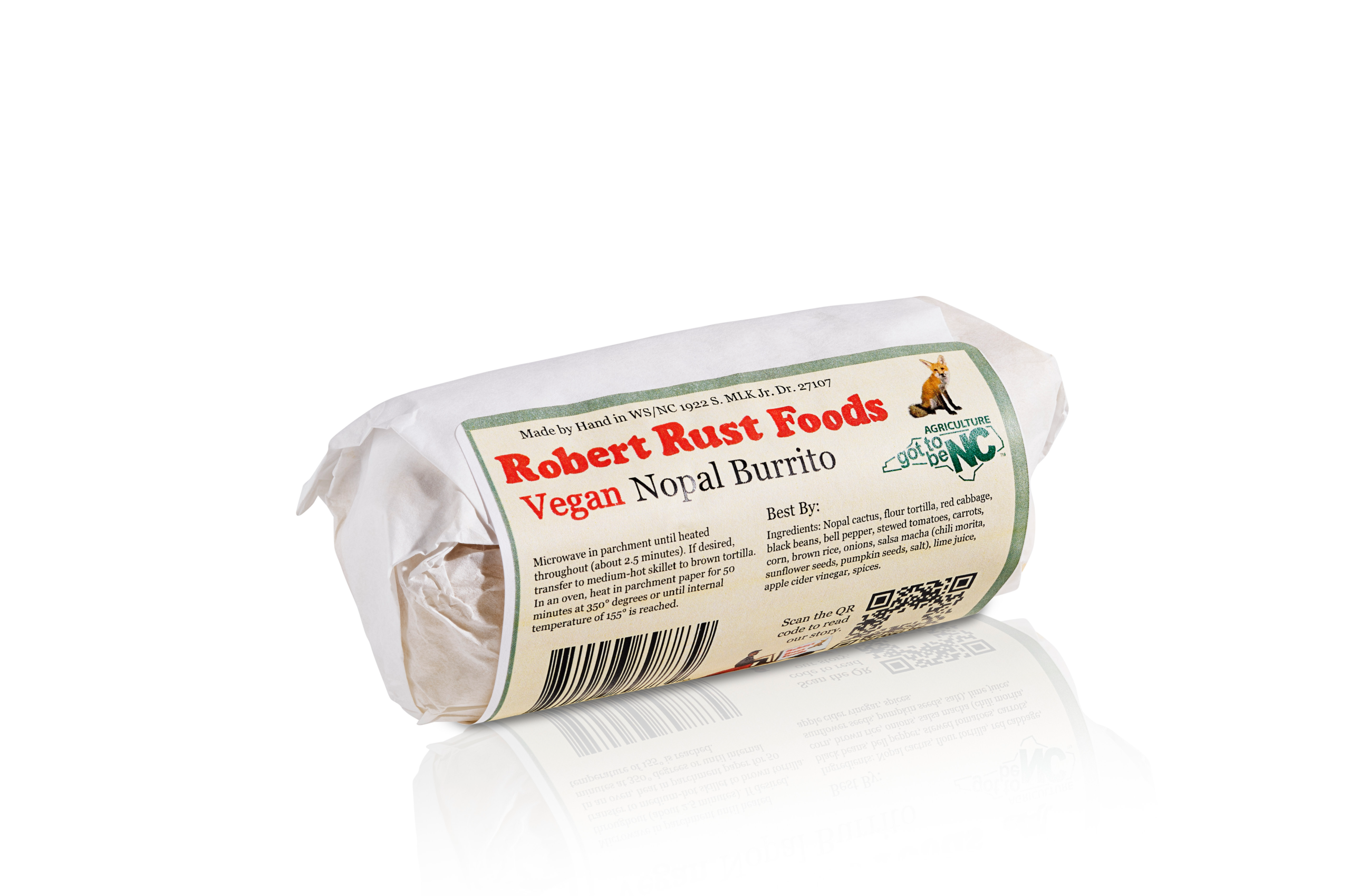 Case of 12 burritos. 8 oz. burrito with nopal, bell pepper, stewed tomato, corn, carrot, rice, black beans, salsa macha, cabbage, and a hand-made flour tortilla.